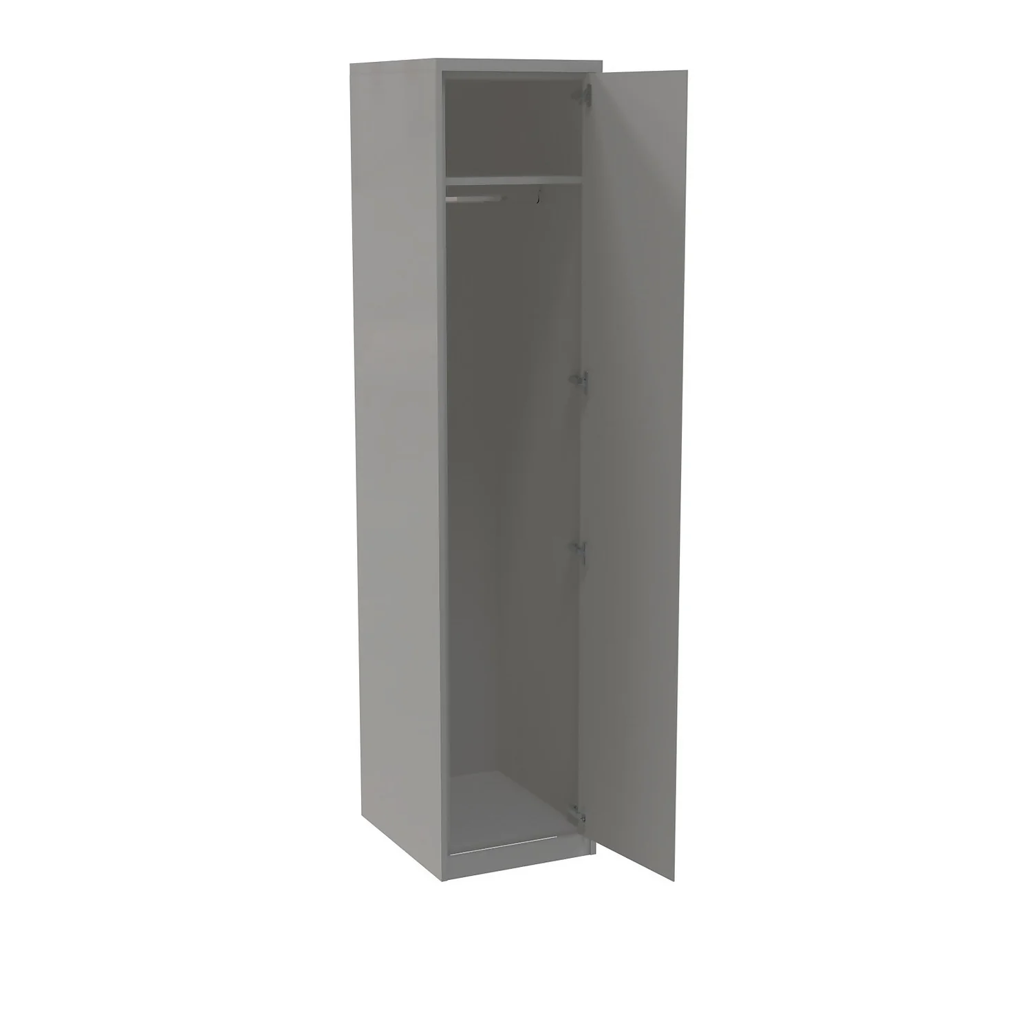 This single wardrobe features a grey internal carcass which includes end panels, plinth and matching cornice all in a finish to match the beautiful luxe handleless gloss grey door. The wardrobe features premium soft close Blum hinges, a shelf and a hanging rail. You can customise your wardrobe with our additional internal storage options (available separately) including internal drawers, shelves, dividing shelves and extra hanging rails.
