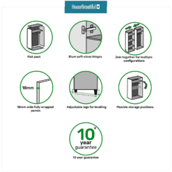 The House Beautiful bedroom range is exclusive to Homebase and offers a selection of different finishes and storage configurations to suit your needs. With a range of carcass colours and contrasting door designs, you can select the look to fit your bedroom aesthetic. This single wardrobe features an oak effect carcass and a beautiful gloss grey handleless door for a modern sleek look. The wardrobe features premium soft-close Blum hinges, a shelf and a hanging rail. You can customise your wardrobe with our additional internal storage options (available separately) including internal drawers, shelves, dividing shelves and extra hanging rails.