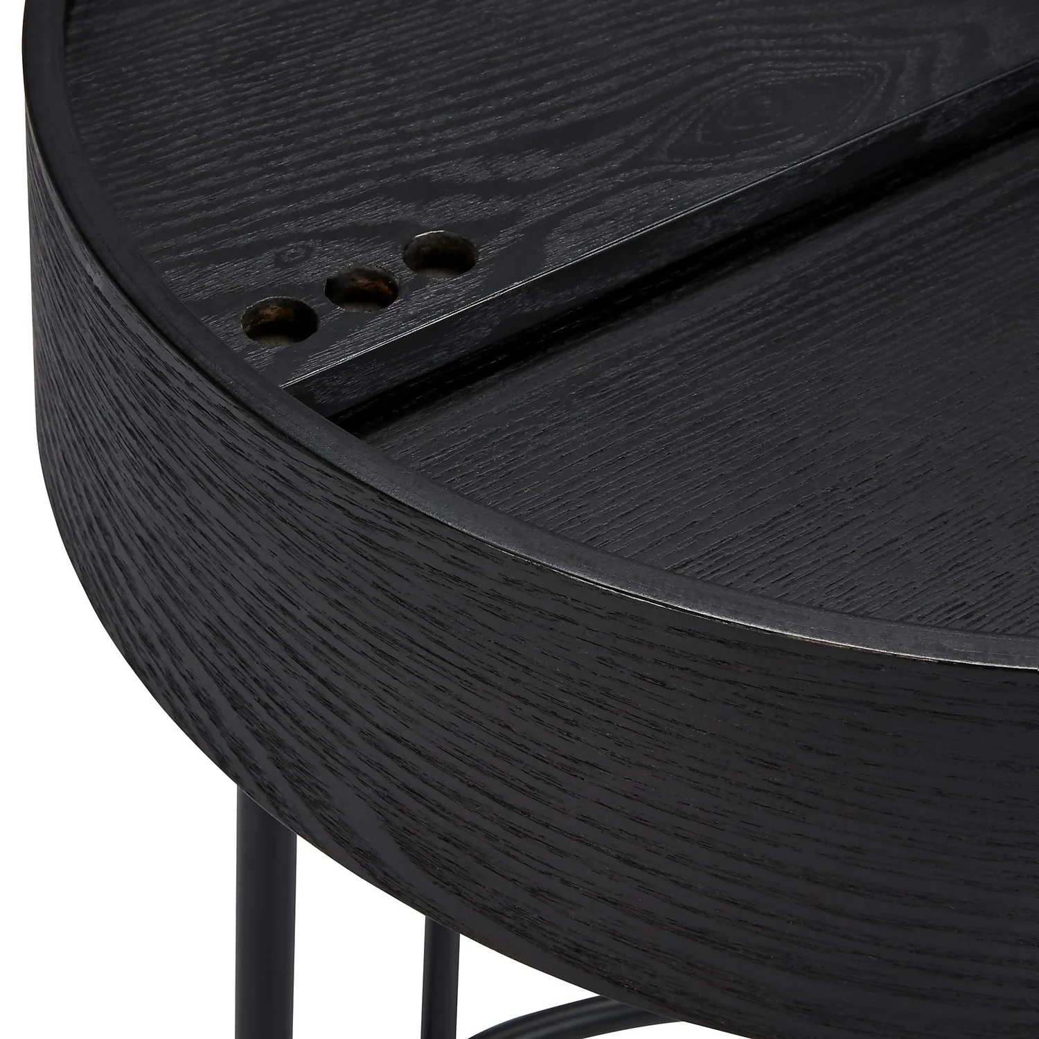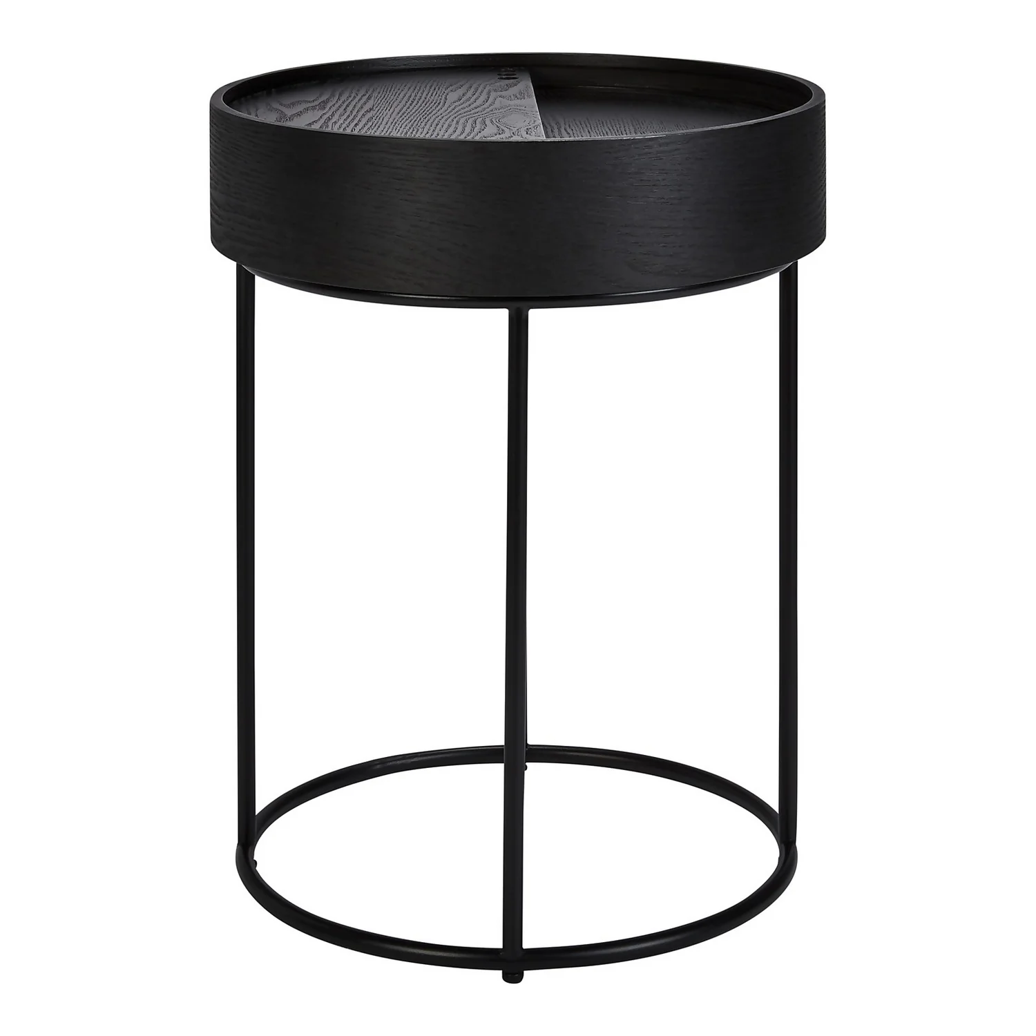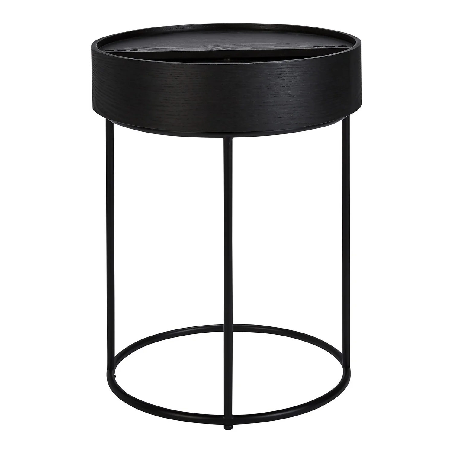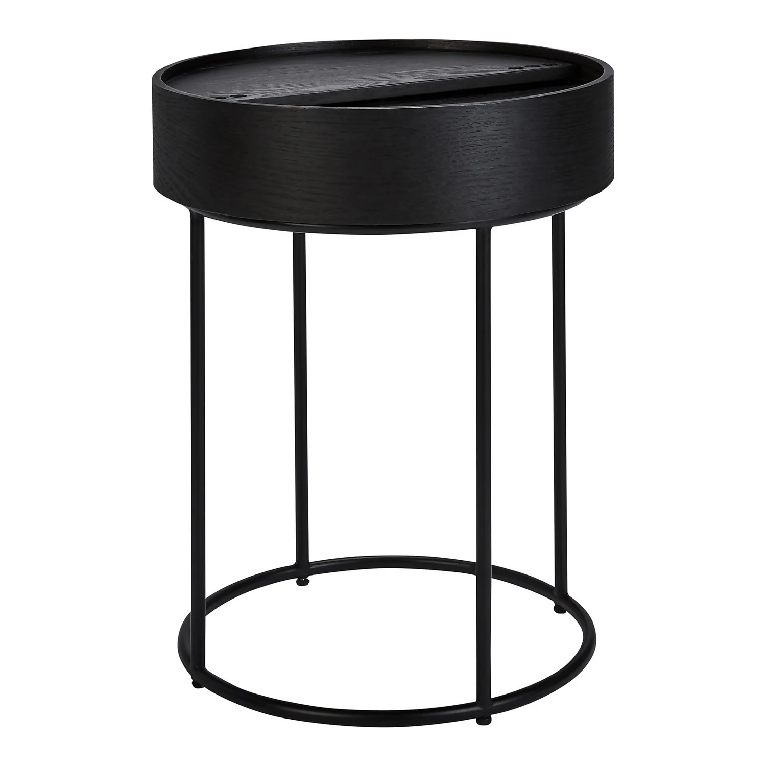 The Halo black ash side table has a hidden storage space in the table top and an elegant black metal base.