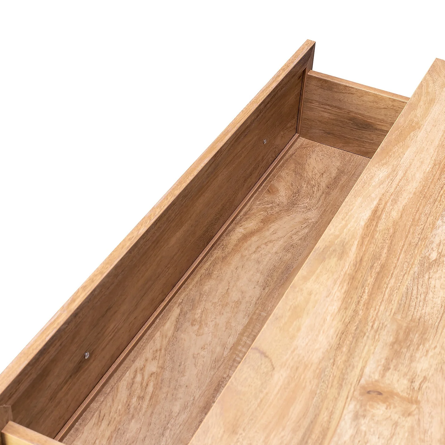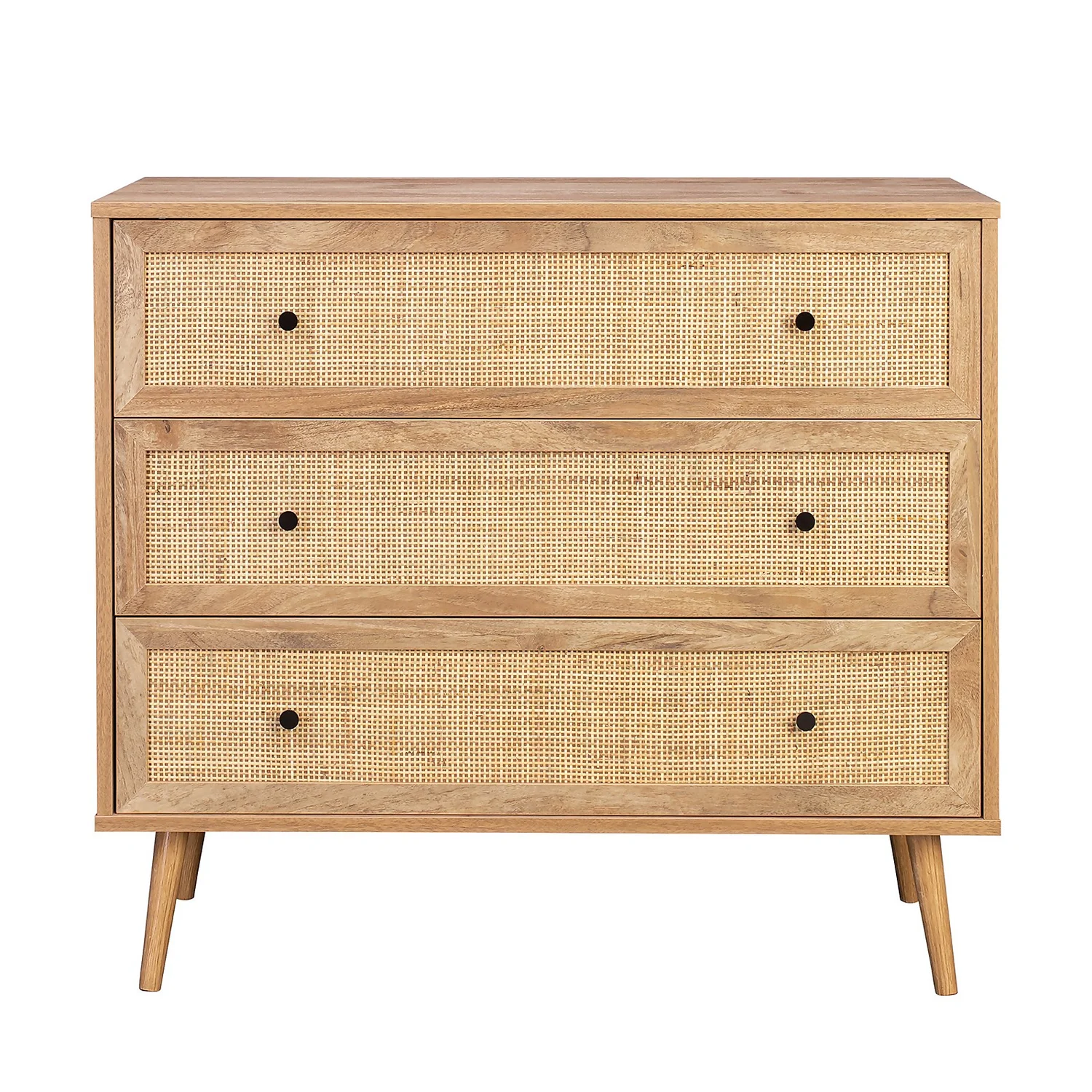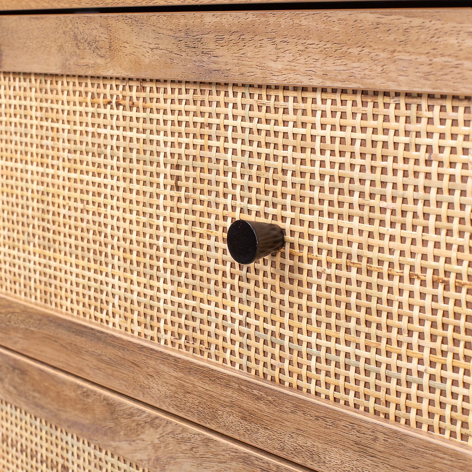 With its charming aesthetic, Kubu is a bohemian beauty. Retro woven cane panels meet hardwearing textured effect oak, making this range a visual treat. Our Kubu 3 drawer chest has ample space for your folded garments. It’s raised from the ground on solid tapered legs. Decorate the top with a choice plant or some family photos. The laidback appeal of the boho look is ideal for the bedroom, creating relaxing vibes that are perfect for your snooze space.